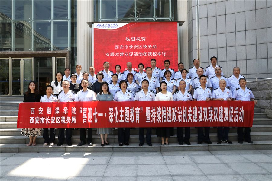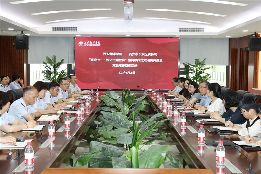 为扎实推进政治机关建设,探索校税共赢新模式,6月26 日上午,我校与长安区税务局“喜迎七一 深化主题教育”双联双建双促活动在我校科技楼举办。长安区税务局党委书记、局长郭朝伟,党委委员、总会计师周雪峰,各党支部书记、纪检员共30余人出席活动。西安翻译学院校长崔智林,党委组织部部长李雪莹及部分教师参会。会议由财务处处长赵驿梅主持。