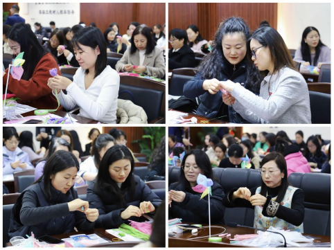活动在轻松愉悦的氛围中拉开帷幕。浦发银行特邀专业花艺师现场指导,带领女性教职工体验“DIY郁金香花束制作”。在花艺师细致讲解与示范下,大家兴致勃勃地投入创作。教职工们用扭扭棒、丝带等材料制作出形态生动的郁金香花束,寓意“幸福与永恒”。不一会儿,一束束色彩斑斓、独具匠心的郁金香花束在她们手中绽放,传递着春天的温暖与节日的美好祝福。